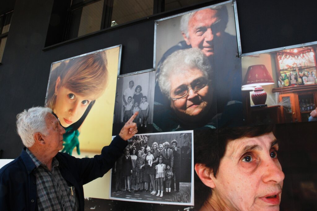 Fotografia colorida de um painel com várias fotos da exposição Fotografia colorida com uma pessoa observando as