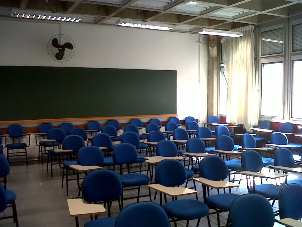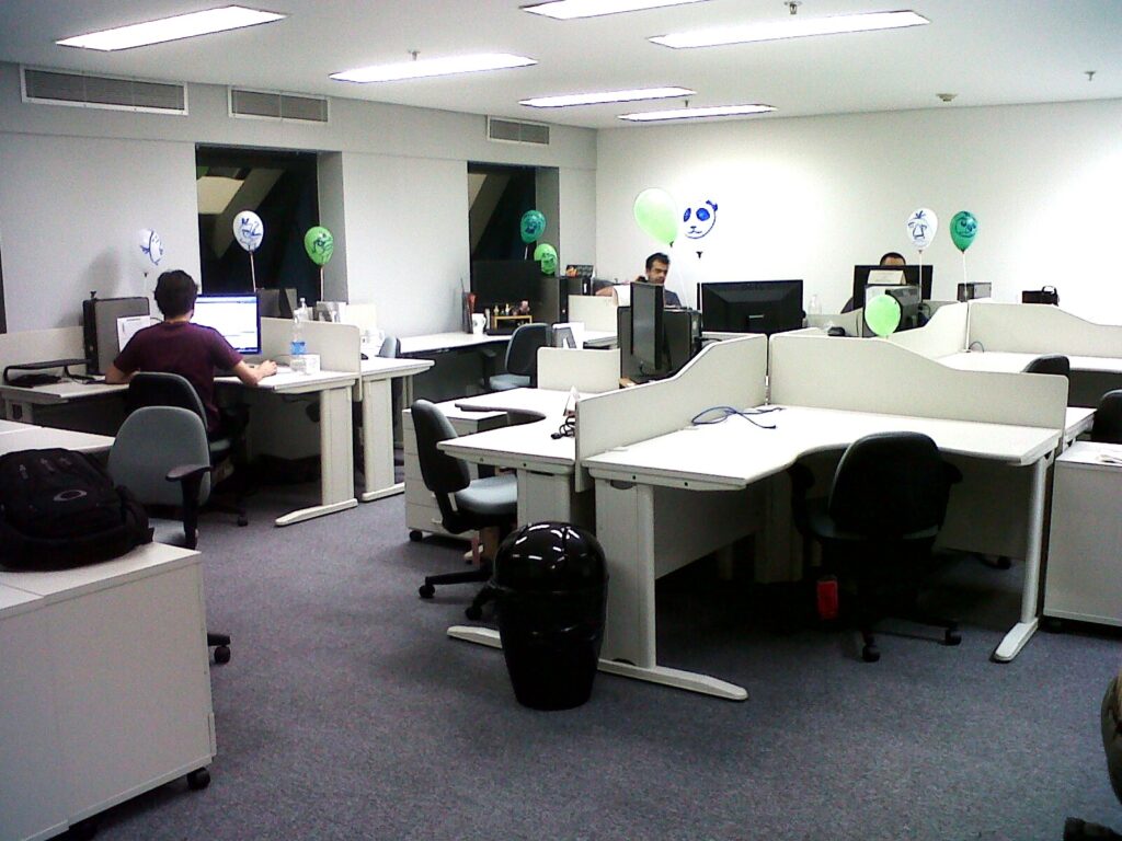 Fotografia de um galpão com pessoas. A iluminação é escura.